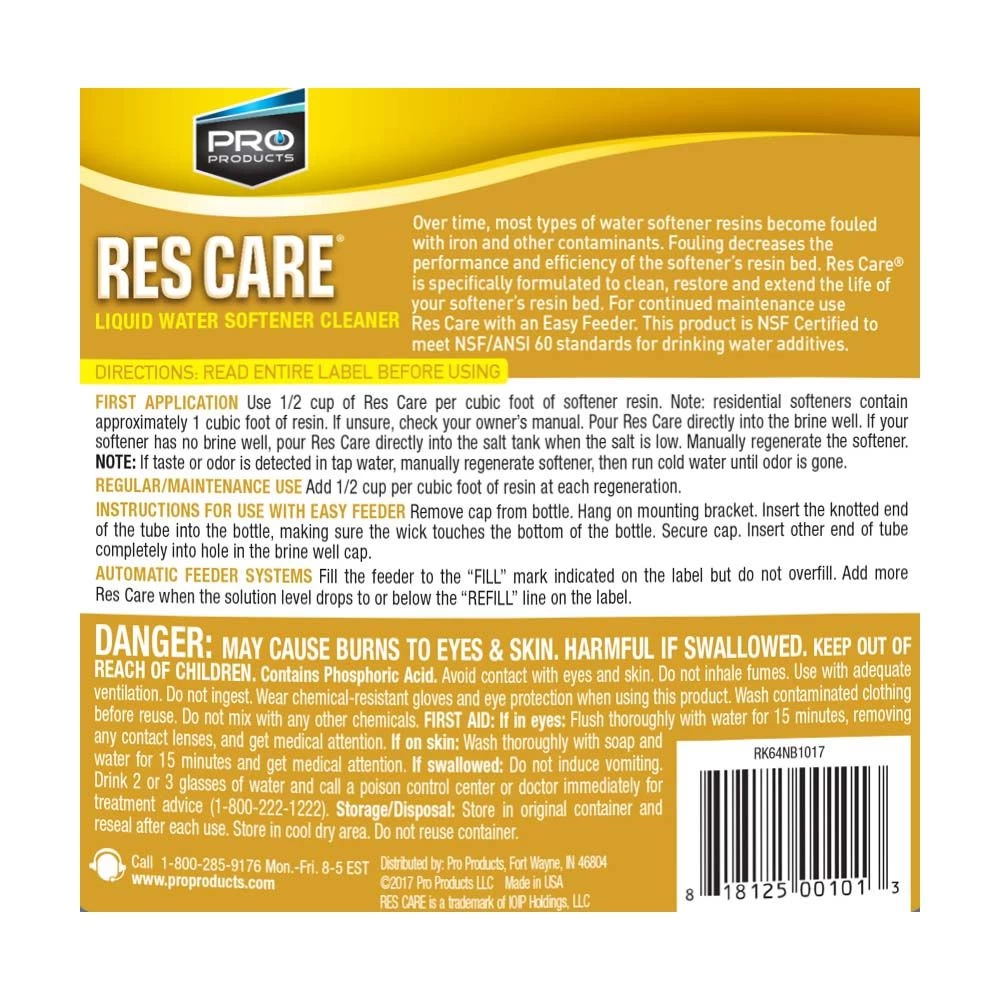 Pro Chemicals RK41N Res Care is a specially formulated liquid resin cleaner designed to clean resin pores of iron, manganese, silt, metal particles and organic compounds that cause softener inefficiencies. Regular use of Pro Products RK41N Resin Cleaner will restore the softener resin back to peak efficiency and maintain the life of the unit. For best results use Res Care Automatic Feeder or manually add during regeneration to prevent mineral build up. Res Care is a more aggressive cleaner compared to Softener Mate.