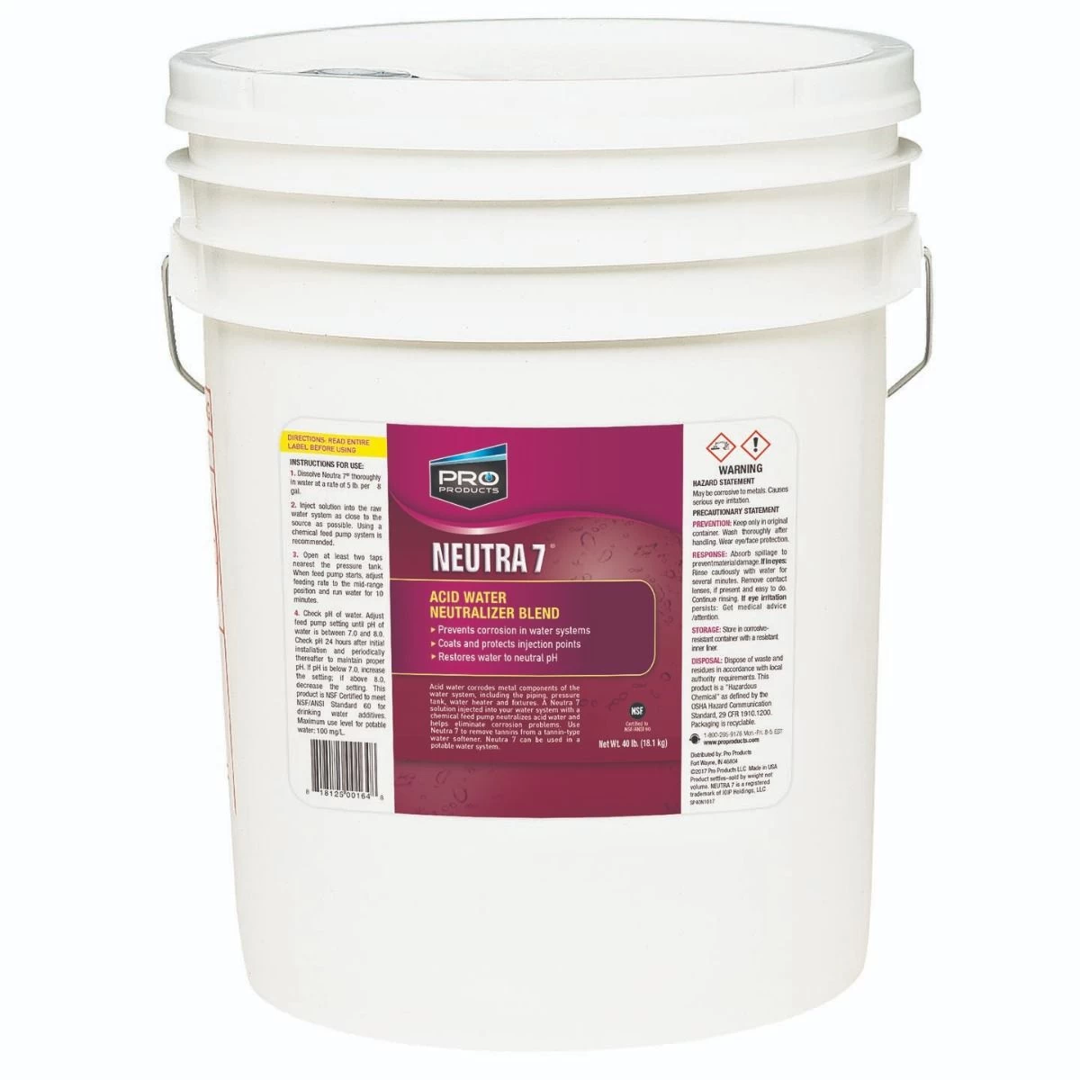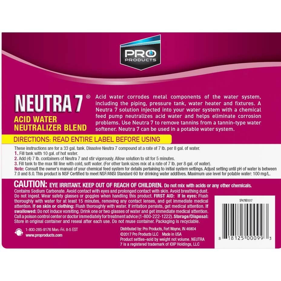 Pro Products Neutra 7 acid water neutralizer that eliminates acid water in potable systems and keeps the injection point clean of build-up. A Pro Neutra 7 solution injected into a water system will eliminate acid water and prevent corrosion. The feed rate depends on the acidity of water. Proper dosage is reached when the pH of the treated water is between 7.0 and 8.0. Pro Neutra 7 is NSF Certified to meet NSF/ANSI Standard 60 for drinking water additives.raise the pH of your water without clogging the pump screens in your treatment system. This neutralizer will help to reduce the risk of corrosion in your systems, piping, pressure tanks, water heaters and fixtures.