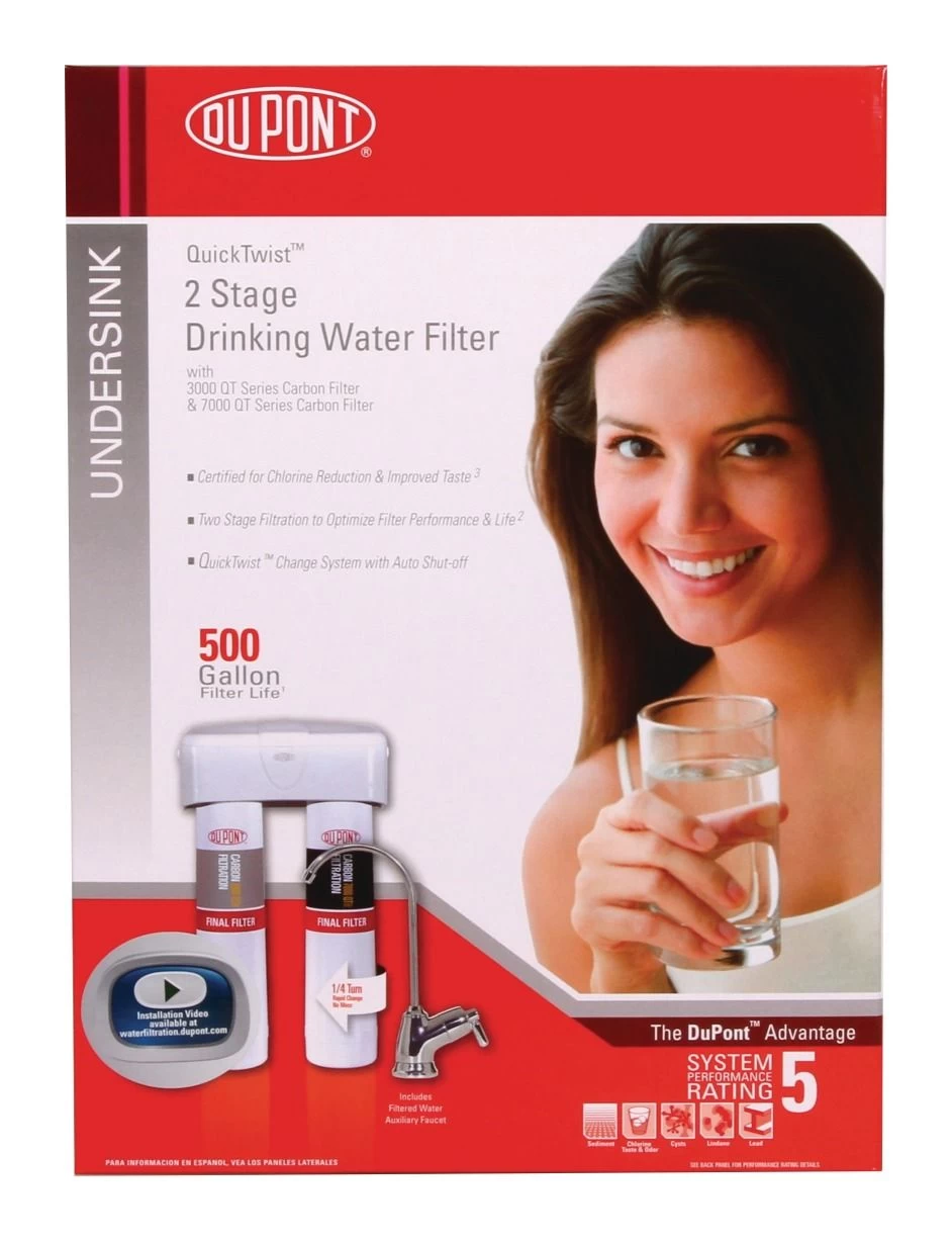 Quick Twist 2-Stage Drinking Water Filtration System QT273005 Includes 3000 Series Carbon Filter and 7000 Series Carbon Filter. Filters up to 500 gallons. Two-stage filtration optimizes undersink water filter life and performance. QuickTwist change system with auto shut-off for easy replacement. Undersink water filter improves taste and clarity. 3 year limited warranty.